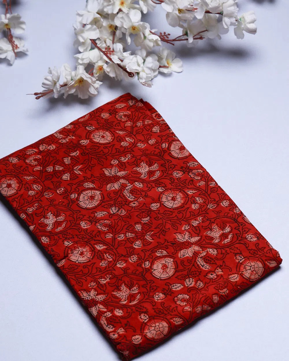 Color & Print: Body: Deep, earthy Brick Red, Terracotta, or Maroon. Print: A dense, all-over pattern of stylized floral medallions and winding vines/foliage, printed in a muted Off-White or Pale Beige tone. The use of traditional colors suggests vegetable dyes might have been used (confirm if applicable).
